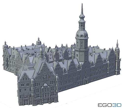 Im Dresnder Residenzschloss befindet sich ein filigranes Modell des gesamten Schlosses, das nicht für jeden zugänglich ist. Wir bekamen den Auftrag, dieses Schlossmodell einzuscannen und zu modifizieren, damit es später in Bronze gegossen werden konnte. Dieses wurde dann in einem der Innenhöfe aufgestellt, zugänglich und berührbar für alle Besucher der Schlossanlage.