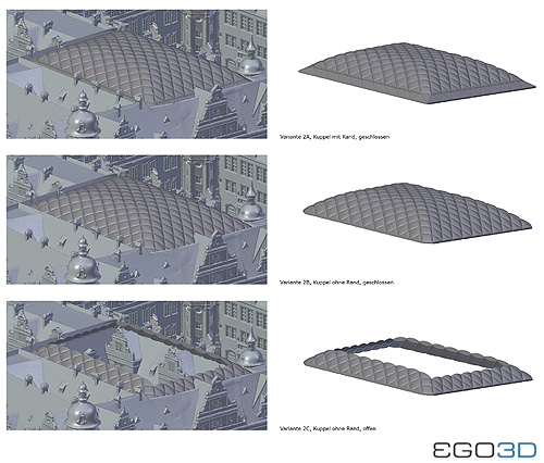 Drei Varianten des Kuppeldachs, das seit einigen Jahren den kleinen Schlosshof überspannt. Die untere Variante ermöglichte weiterhin den Blick in den Innenhof und wurde schließlich so ähnlich umgesetzt. Besondere Ausführungen wie dieses Kuppeldach sind immer möglich. Ein digitales Modell am Rechner kann beliebig ergänzt und verändert werden.