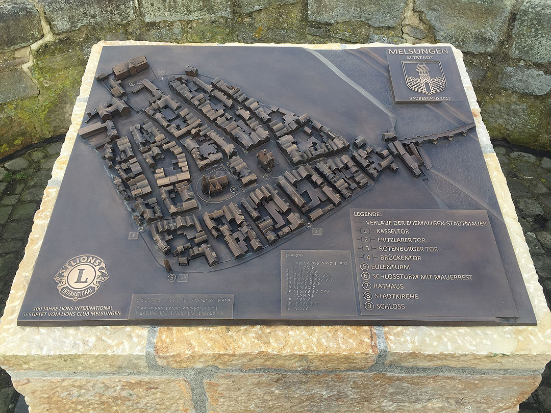In der Gießerei wurde schließlich Das Gelände im Sandguss hergestellt, die Gebäude im Wachsausschmelzverfahren. Heute hat das fertige Bronzemodell Melsungens einen prominenten Platz am Eingang zur Altstadt, wenn man diese über die Brücke über die Fulda betritt.