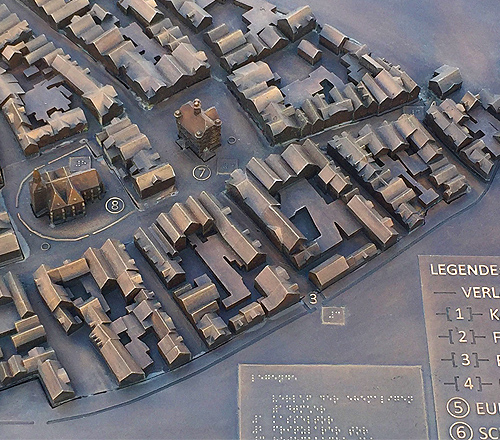 Die detailierter ausgeführten Gebäude und weitere Infos zu Stadtmauer wurden in einer Legende aufgeführt und mit Zahlen auf dem Modell bezeichnet. Weitere separate Legenden führen die Details in Blindenschrift auf, so dass das Modell sich auch als Tastmodell eignet.