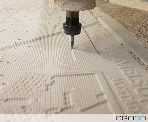 Zeile für Zeile arbeitet der Fräser das Gelände, das Sponsorenlogo und die Schrift der Legenden aus dem Material, erst grob, dann immer feiner, bis zur gewünschten Detaildichte.